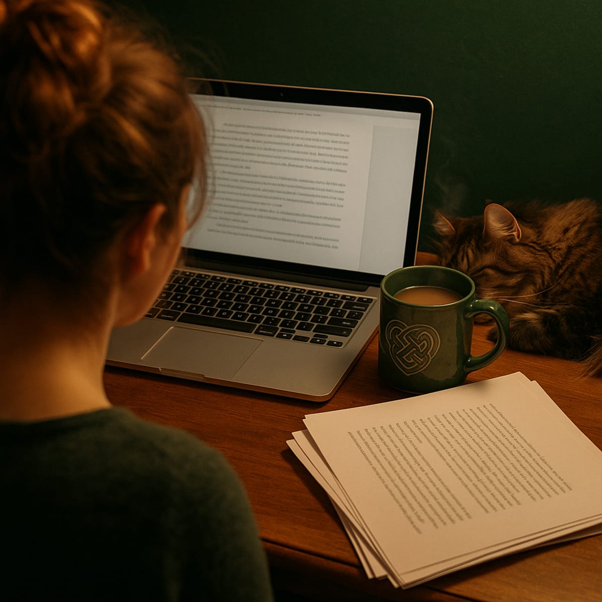 For twenty years, I worked a 9-to-5—writing on scraps of lunch breaks, on rainy commutes, in the cracks between bills and deadlines. Since 2023, I’ve been a full-time writer. The routine is sacred now: up at 4 or 6 a.m., coffee or tea in hand, my cats curled nearby, typing before the world wakes up. My best ideas show up in the hush of early morning, or when I’m walking in nature, toes in the sand, salty air clearing out the noise. Beaches, forests, thunderstorms—there’s nowhere I feel more like myself.